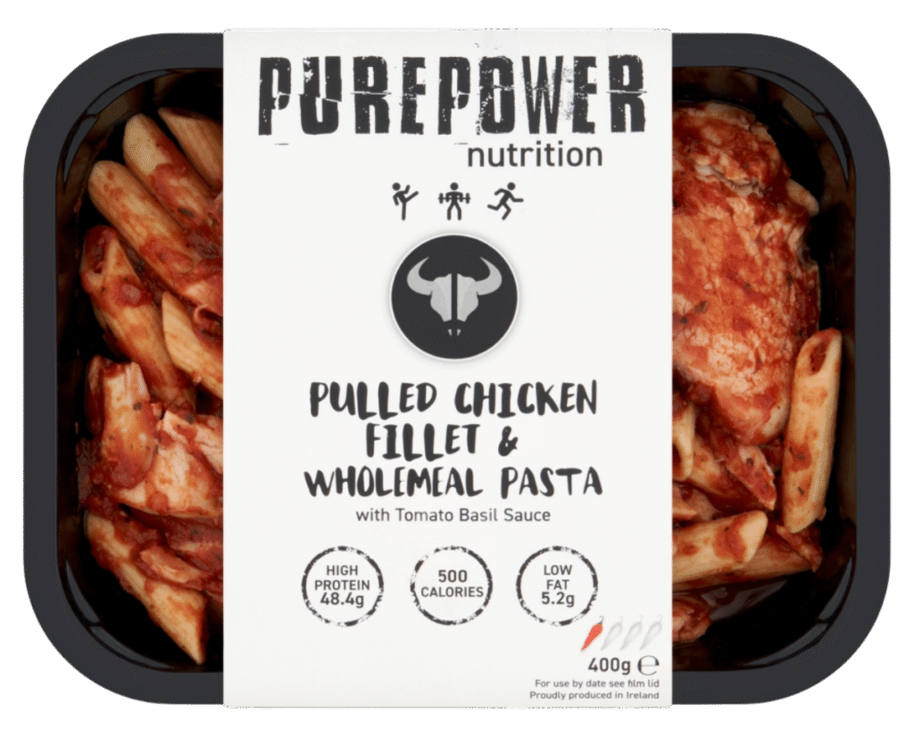 Introducing PUREPOWER Nutrition’s Pulled Chicken Fillet & Wholemeal Pasta – this baby is a whopping 48.4g of protein, has clean ingredients, and only 500 calories.
